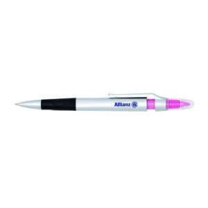 Caneta plástica com marca texto, contém detalhe emborrachado e tampa protetora para o marca texto. Carga esferográfica azul e acionamento por clique.