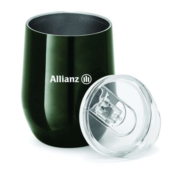 Copo de viagem em aço inox, térmico com parede dupla isolada a vácuo e tampa deslizante. Capacidade até 400 mL. Preserva as bebidas quentes por 6h e frias por 12h. Fornecida em caixa presente. Certificação EU Food Grade. 88 x 112 mm